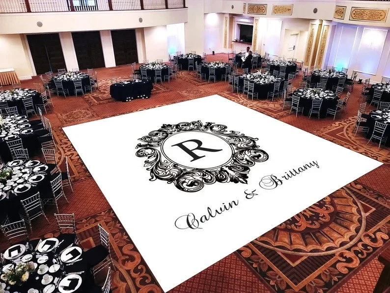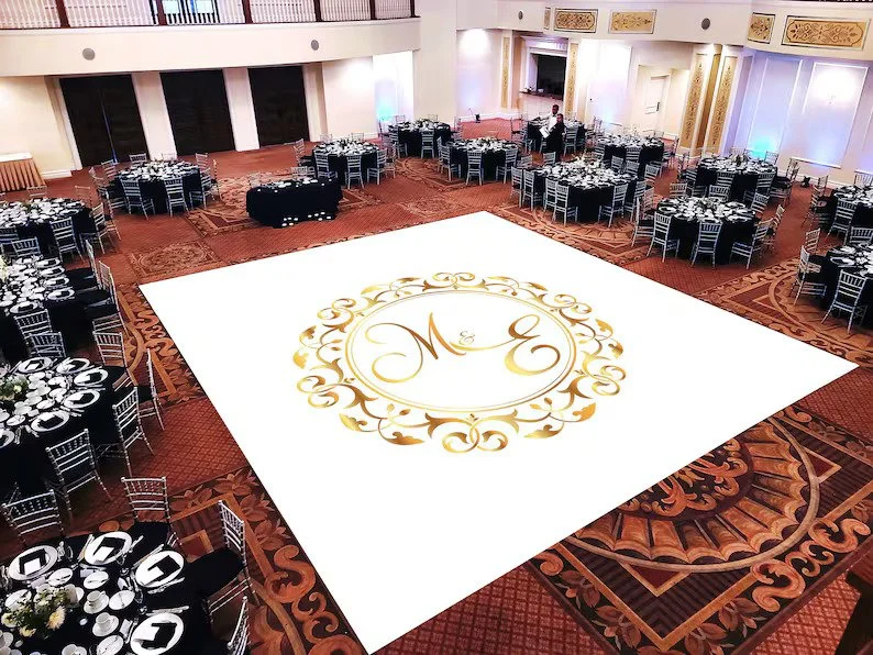 Transform your event space with a stunning custom wedding dance floor decal. This elegant, personalized vinyl wrap features a beautiful monogram, such as the M&D shown, making it the perfect centerpiece for your wedding reception, engagement party, or anniversary celebration.